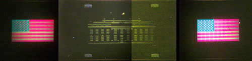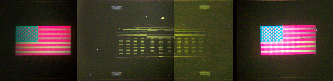 All told, the chip features 15 monochrome images of the White House flanked by six full-color American flags, embedded with microscopic features that reflect the colors of the stars and stripes. There are three visible White House images and a dozen nano-size ones, 500 microns wide and 225 microns high (a micron is one-thousandth of a millimeter), that appear as dots without magnification. All the White House images are flying an American flag.