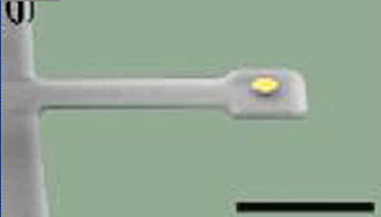 Antibodies also have been used to bind virus particles or proteins to a cantilever, the researchers say, but for the experiment reported in the Journal of Applied Physics, they attached tiny gold dots as small as 50 nanometers in diameter to the ends of the cantilevers. The dots then were exposed to a sulfur-based organic chemical that naturally binds to gold, which formed a single layer of a few hundred molecules on the surfaces of the dots. From the frequency shift that resulted, the researchers calculated that the mass added to a typical 50-nanometer gold dot was 6.3 attograms.