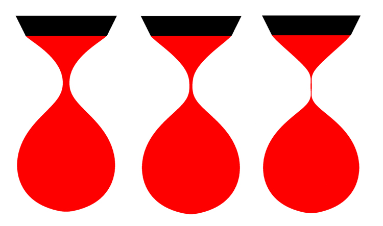 The researchers made the discovery while studying how liquid drops and gas bubbles are formed by nozzles, such as those in inkjet printers. A widely accepted universal rule holds that, no matter what the liquid or gas is made of, drops and bubbles always break away from a nozzle the same way: As the drop is forming, it is attached to the nozzle by a thin segment of liquid or gas. This connecting segment grows progressively thinner, and as its width gets closer and closer to zero it breaks at a single point and the drop falls away from the nozzle.
