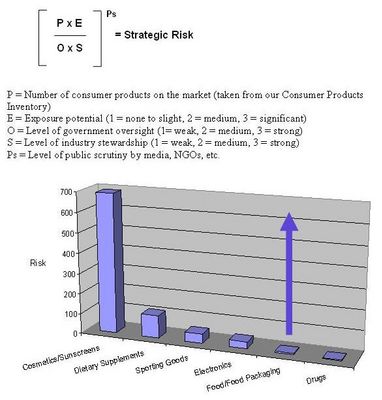 To begin to sort out strategic risks across sectors in which nanotechnology is being used, we developed a simple algorithm that takes into account some basic parameters, such as market penetration, exposure route (as a surrogate indicator of health risk), government oversight (or lack thereof), industry stewardship (or lack thereof), and the level of public scrutiny by media and/or NGOs (4). The formula and outcomes are shown in Figure 1.