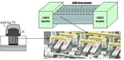 | Figure 1: Proposed CMOS-nano IC utilizing carbon nanotubes and graphenes as interconnects. |