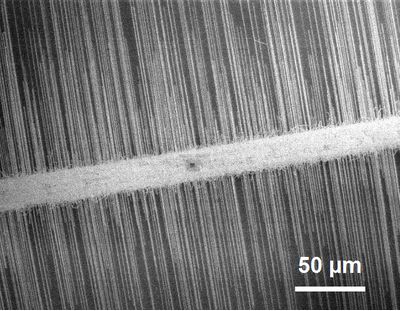 | An SEM image of densely aligned SWCNT arrays grown from the NSM-generated catalyst stripe on quartz substrate (source: Asst/P Hua Zhang, MSE-NTU) |