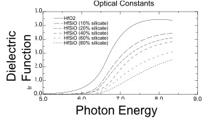 A variety of optical measurements are useful for nanoscale films. Ellipsometry, photoreflectance, and second harmonic generation have all been used to characterize nanoscale materials. Ellipsometry is frequently used to measure the thickness of dielectric, semiconductor and thin metal films. It can also determine the dielectric function of new materials when the thickness is known. The dielectric function of the high k films changes with the composition of the film. For example, the amount to silicate in hafnium silicate and the process conditions both have a strong impact on the dielectric function and thus optical response as shown in figure 1. Ellipsometry is an excellent means of controlling manufacturing processes such as those used to fabricate the gate stack. Photoreflectance provides a means of characterizing the stress in single crystal semiconductor films. This method is well suited to characterizing silicon-germanium films used as the transistor channel. Second harmonic generation is a useful method of characterizing interfacial properties especially ones between a dielectric and semiconductor.