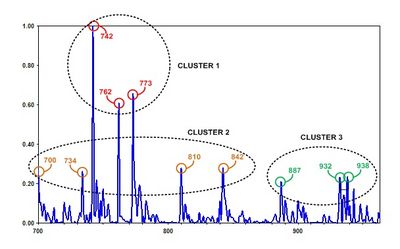 In 2010, the USPTO issued a total of 780 patents under Class 977. This was a 47% increase from the 530 patents issued in 2009. Of the 780 patents, 423 patents had two or more corresponding sub-classes and 132 patents had three or more corresponding sub-classes. In other words, the USPTO typically assigns one or two sub-classes under Class 977 to help examiners carry out prior art searches. By looking at the frequency with which particular sub-classes are assigned, one can get a picture of the technical areas of patents issued under Class 977 that seem to be most active. The chart shown below is a normalized plot of the frequency with which all the sub-classes under Class 977, that is, sub-classes 700-963, were assigned to patents that issued in 2010. The normalization is used to account for the fact that the number of sub-classes assigned to any one patent varies across the compilation. The peaks in the frequency of sub-class assignment can correspond to areas in which the level of patenting activity is high.