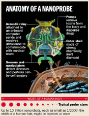 Nanoprobe: Nanoscale machines used to diagnose, image, report on, and treat disease within the body. See "Cell Repair Machine", "Nanites", "Nanobots", and "Nanomachine". Also: tips for scanning probe microscopes.