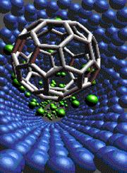 Click to enlarge Copyright ORNL. See Materials by Computational Design and Atomistic Simulations. This figure presents a visualization of a nanohydraulic piston. The model consists of a Carbon nanotube (blue), Helium atoms (green), and a "Buckyball" molecule. It is used to explore the stability of the system. |