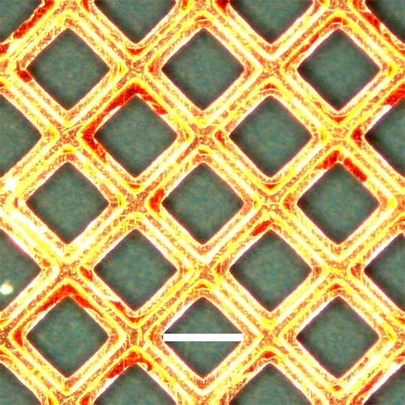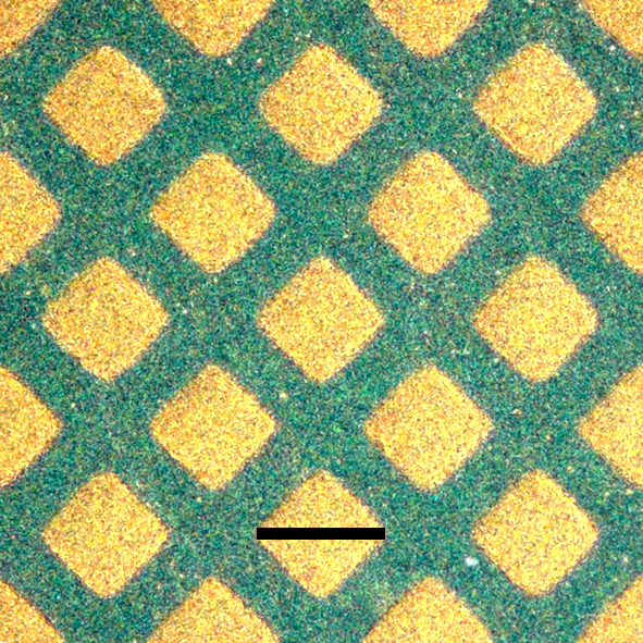 Click to enlarge. Optical microscope images show that flash welding through a copper grid reproduces the grid pattern on a polyaniline nanofiber film. The chemists put a copper grid on top of a nanofiber film (Figure 4a) and used it as a photomask for flash welding. After welding, they removed the mask and observed the grid pattern produced on the nanofiber film (Figure 4b). The areas exposed to the camera flash (the squares) are smooth and therefore appear bright gold because of the reflectance of incident light. The protected areas (the lines) remain as green nanofibers and appear darker because the rough surface scatters light and yields low reflectance. The high contrast between the resulting patterns is due to a change in reflectivity induced by flash welding. Courtesy and © Copyright UCLA |
