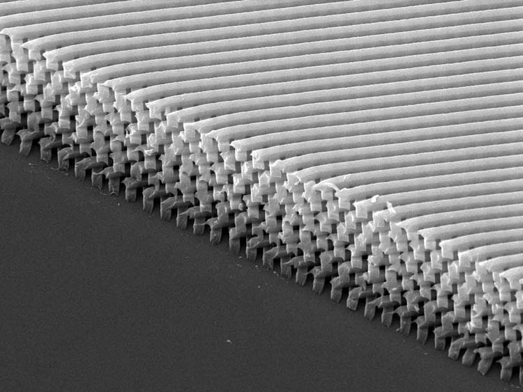 The modified technique involves meticulous work at the micron-scale level. (For size reference, the period at the end of this sentence equals approximately 615 microns.) First, an elastomer mold is created with more than 1,000 microchannels on its surface. The channels are filled by hand with a liquid polymer filler. The filler is then solidified by ultraviolet light. Next, the solidified polymer rods in the channels are coated with a second polymer that acts as a glue, bonding the filler to a silicon wafer substrate. Once hardened, the elastomer mold is peeled off, leaving a set of parallel polymer rods on the substrate – one layer of the polymer template. By repeating the procedure, in principle, any number of multilayer structures is achievable. To convert the template to a ceramic photonic crystal, the template is over-infiltrated with a titania slurry. The structure is fired to 550 degrees Celsius (1022 F) to remove the template and sinter the titania structure.
