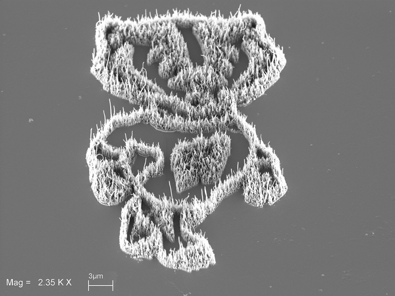 The fibers, and NanoBucky, are "grown" in a plasma deposition chamber where a mix of acetylene and ammonia gas are used with electrical current to prompt the growth of the nanofibers on a silicon substrate patterned with a nickel catalyst. The pattern for the catalyst is composed on a computer and is then traced on the substrate by a beam of electrons.