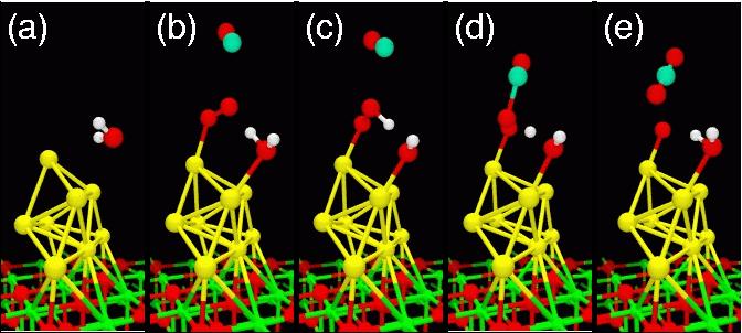 Now, this relationship can’t last because the addition of the hydrogen to the oxygen molecule to form OOH weakens the bond between the two oxygen atoms. All it takes to break that bond is a carbon monoxide molecule approaching from the gas phase, which bonds to one of the oxygens of the OOH to form carbon dioxide. This leaves the proton to return to the hydroxyl to reform the water molecule. The product carbon dioxide desorbes readily from the surface, and the left over oxygen atom stays bonded to the gold. But this single oxygen atom is very active (as singles often are) and is easily led away when another carbon monoxide comes along to bond with it to make a second carbon dioxide molecule.