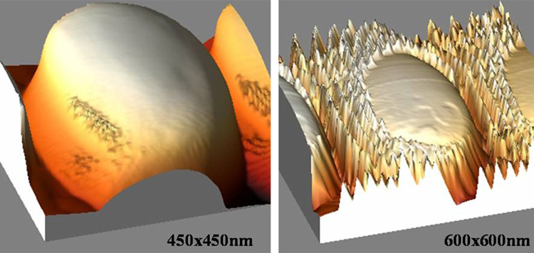 One way to decrease the sticking is to increase the amplitude, or how far the probe moves each time it vibrates across the surface. With each oscillation, the tube sweeps close to the surface of the object and then swings in the opposite direction, constantly repeating the motion. As the vibrating probe sticks to the sides of a structure, the microscope's computerized controller pulls the tip farther from the surface. Then, after the tip is pulled away, it starts vibrating normally again, and the controller repositions it closer to the surface, again resulting in the sticking action. This cycle repeats, causing the image artifacts.