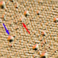 | Comparison of an STM topographic image of a section of graphene sheet (top left) with spectroscopy images of electron interference at three different energies shows strong interference patterns generated by atomic scale defects in the graphene crystal (red arrows) but only modest disturbances caused by larger scale bumps in the sheet (blue arrows.) Analysis of the ripples shows that the electron energy in graphene is inversely proportional to its wavelength, just like light waves. The area imaged is approximately 40 nanometers square.