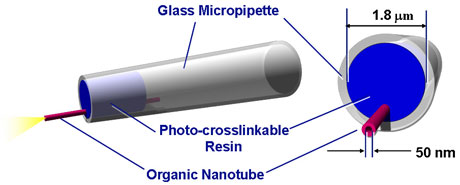 * We succeeded in fixing an organic nanotube with an inner diameter of 50 nm onto the tip of a glass micropipette with an inner diameter of 1,800 nm by using micromanipulation technology.