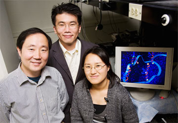 Chemistry professor Yi Lu, left, physics professor Taekjip Ha and graduate research assistant and lead author Hee-Kyung Kim have found clear evidence that a lead-specific DNAzyme uses the “lock and key” reaction mechanism. In the presence of zinc or magnesium, however, the same DNAzyme uses the “induced fit” reaction mechanism, similar to that used by ribozymes. |