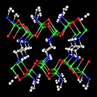 | The crystal structure of -ZnTe(en)0:5, determined by single-crystal X-ray diffraction. Two-monolayerthick ZnTe slabs are interconnected by ethylenediamine (C2N2H8) molecules bonded to zinc atoms. Zn-Green, Te-Red, N-Blue,and C-Gray. Hydrogen atoms are omitted for clarity. |