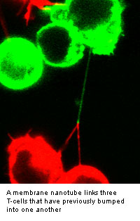 This kind of link has previously been observed forming between other kinds of cells, including brain cells and other kinds of immune system cells, but this is the first time that it has been found in T-cells. A similar kind of link is created when cells divide to create new cells, but the newly-discovered nanotubes are different because they have distinct break, or junction, where the membrane material from each of the two cells meets.