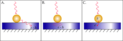 | Light can be converted to electricity via plasmon resonances in nanoparticles, by: A: a far field effect which prolongs the optical path through the cell, B: a near field effect which locally enhance the energy conversion in the solar cell, or C: a creation of energy rich charge carriers which are transferred to the solar cell. Image: Carl Hägglund |