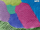 | Image / Boston College, MIT, and GMZ Inc. A cross-section of nano-crystalline bismuth antimony telluride grains, as viewed through transmission electron microscope. Colors highlight the features of each grain of the semiconductor alloy in bulk form. A team of researchers from Boston College and MIT produced a major increase in thermoelectric efficiency after using nanotechnology to structure the material, which is commonly used in industry and research. |