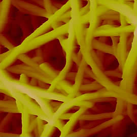 | Figure 1: Atomic force micrograph of multi-walled carbon nanotubes in buckypaper. Each of these nanotubes is 10,000 times thinner than a human hair. |