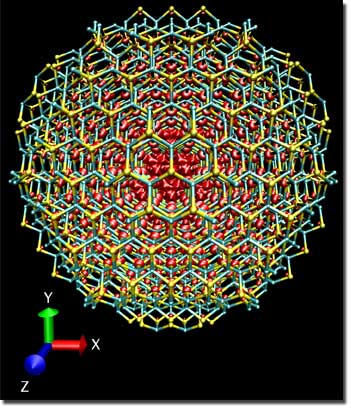 | Fluorescence from CdSe quantum dot solids in environments varying from stable to high unstable show that small deviations from uniform stress distribution greatly affect the electronic properties. The blue represents cadmium, the yellow represents selenium and the red represents a cloud of electrons in their excited state. Image by Sebastien Hamel/LLNL |