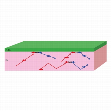 | Figure 1: Electron scatterings inside copper (Cu) sometimes flip the spin directions. On the other hand, scatterings at the boundary between Cu and copper oxide (CuOx) flip the spin every time.