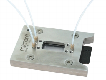Fluidic Connect offers a solution for two major problems in the use of lab-on-a-chip, namely integration with existing equipment, and replacement of microfluidic chips. "Fluidic Connect allows the use of standard laboratory equipment in combination with microfluidic chips", explains Ronny van Œt Oever, CTO and co-founder of Micronit. "With Fluidic Connect, a larger chip area can be detected with a microscope objective. The user-friendly chip cartridge with the size of a microscope slide enables an easy chip connection. The chip holder guarantees a leak-free connection up to 100 bars and 100 degrees Celsius."