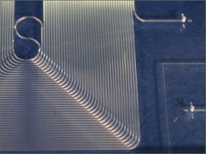 For this project Dolomite had to create a microfluidic device with an amazing 7.5m of micro-channel running through a 10cm square piece of glass. This is one of the largest devices and longest channels so far developed by Dolomite (this technology tends to be based in a smaller format). The fabrication processes used to create such a microfluidic device have some similarity to those used in the electronics industry. The channels through which the fluids flow and interact are etched into materials such as glass or polymers using similar photolithography processes, for example. The patterned layers are then very accurately aligned and fused together and drilled to provide microscopic ports through which the chemicals or gases can enter and leave the device.