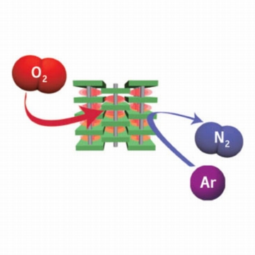 | Figure 1: Selective gas adsorption of flexible PCPs. The onset pressure for the gate-opening process is lower for oxygen (O2) than for nitrogen (N2) and argon (Ar). As a result, within a certain pressure range, only oxygen adsorbs. |