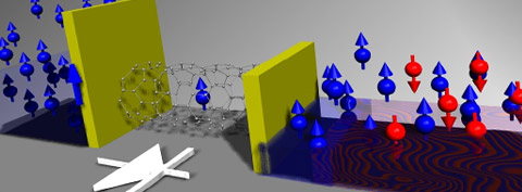 | Spin-diode with a nanotube quantum dot (QD) poised between a ferromagnetic (blue) and a non-ferromagnetic metal electrode (red and blue). Yellow walls represent contact barriers between the QD and the electrodes. Credit: Christopher Merchant/JHU |