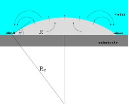 | A bubble on the surface (radius R, contact angle θ); at the edges gas flows inwards and achieves an equilibrium with the outflow of gas. This results in a bubble that can remain intact for a long time. |