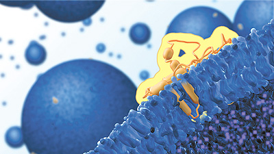 | This image from an animation created by Ammon Posey, Martin Rietveld and the Hill Lab depicts a Bcl-XI protein creating a pore in a lipid vesicle. |