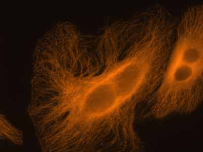| Fixed and permeabilized HeLa cells were labeled with mouse anti-α-tubulin primary antibody and 20nM Qdot 625 goat anti-mouse IgG. Photo: Invitrogen Corporation. |
