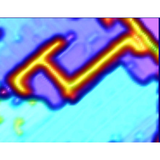 | Figure 1: Scanning-tunneling microscopy image of acetophenone lines on a silicon surface. The lines of acetophenone can be seen as a bright orange line against the blue background of the surface. |