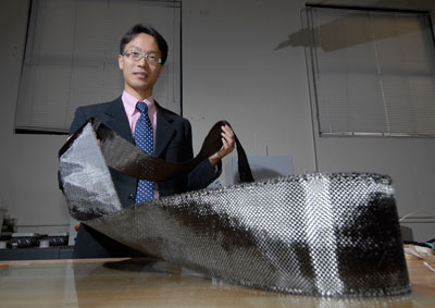 | Jonghwan Suhr envisions using the pliable manufactured nanocomposites to allow airplanes and aerospace vehicles to cut through the air more efficiently, saving fuel. Photo by Crista Hecht. |