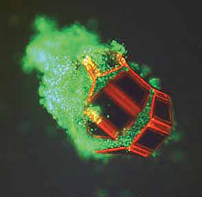 | This fluorescent micrograph features a single microgripper with live cells within its grasp. The tetherless microgripper was triggered to close and capture these live fibroblast cells with thermobiochemical cues. |