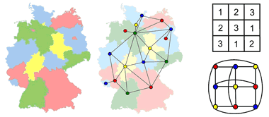 | Fig. 1: Left and center: A map of Germany with corresponding representation as a network. Top right: A simplified sudoku with three rows of three boxes. Bottom right: The representation as a network. "1" is represented in "red", "2" in "blue" and "3" in "yellow".