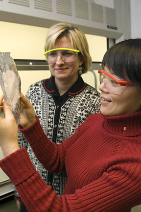 | Margaret Frey, left, associate professor of fiber science and apparel design, and research associate Chunhui Xiang have developed a method to deliver pesticides via nanofibers. |