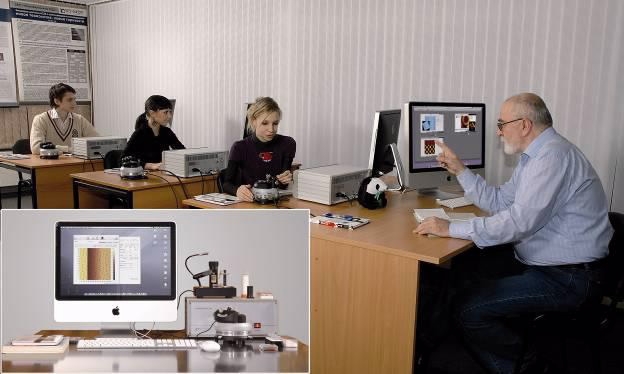 The scientific training laboratory developed by NT-MDT is a class equipped with several sets of training Scanning Probe Microscopes NanoEducator. In the process of training the students learn the practical basis of nanotechnology. All the microscopes in the class are networked. The networking allows a teacher to monitor and control the process of investigation of nanosized objects by a student in the class with high comfort and educational level.