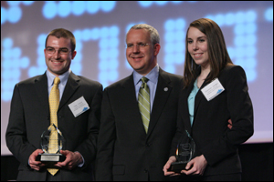 | Governor Brad Henry presents Chas Craig (left) and Shannon Jarmer with the Innovation Award during the 2009 Governor's Cup Competition. |