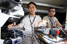 | Purdue graduate students Han-Sheng Chuang and Ahmed Amin use a microscope and other equipment to watch the performance of a prototype lab on a chip capable of being programmed to carry out a variety of jobs. The innovation is a step toward more widespread use of the miniature analytical tools used to measure everything from blood glucose to viruses and bacteria to genes. (Purdue News Service photo/Andrew Hancock) |