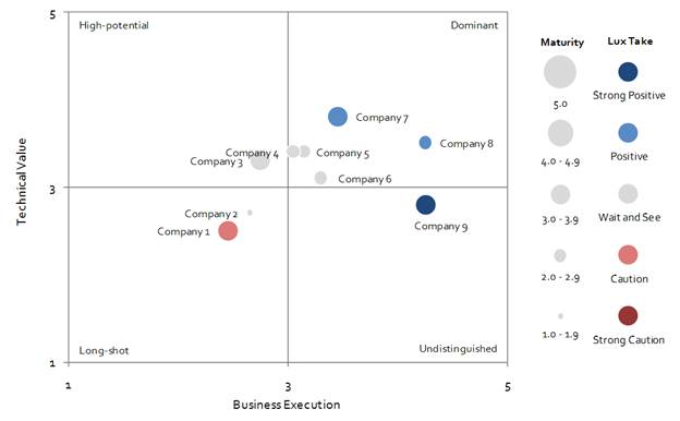 The Lux Innovation Grid provides a visually intuitive snapshot of individual companies in a given technology area, based on three criteria - the strength and value of their core technology, their business execution, and their maturity - as well as Lux Research's own "Lux Take." The scoring is based on factual information collected in primary interviews and site visits, in addition to Lux Research analysts' independent evaluation of the company on 10 different factors, as well as Lux's market insights in each technology domain. For more details on the Lux Innovation Grid, see www.luxresearchinc.com/lig.