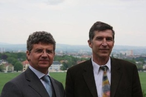 | Prof. Stamm from the Leibniz Institute of Polymer Research (right) and Bruno Linn, Director Sales Europe from Carl Zeiss Nano Technology Systems division welcomed the guests. (Photo: Business Wire) |