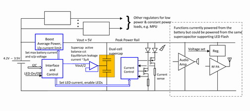 | Supercapacitor-Optimized LED Flash Drivers Integrate Circuitry Outlined in Blue |
