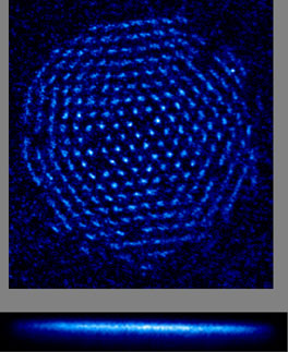 | Under certain conditions, trapped beryllium ions form a hexagonal single-plane crystal. This crystal consists of about 300 ions that are spaced about 10 micrometers apart and are fluorescing (scattering laser light). An array of ions such as this might be used as a memory device in a quantum computer.