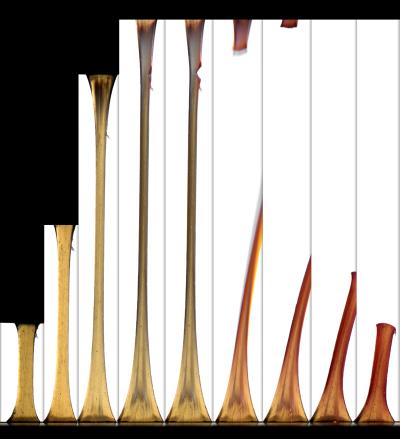 | This shows progressive images of a mechanophore linked elastomer during tensile loading. After the polymer reaches a critical strain, a force-induced red color results from selective covalent bond cleavage in the mechanophore just prior to failure.