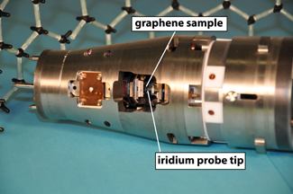 | NIST-built STM “shuttle” module contains the atomic-scale position-and-scan system. Graphene sample and probe tip are in the center opening. Shuttle moves between a room-temperature vacuum environment for loading to an ultracold environment for measuring. Model in background shows graphene’s honeycomb structure.
