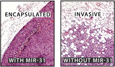 The screened samples were classified as either metastatic cancer or non-metastatic cancer. After analysis, the microRNA miR-31 stood out because of its inverse correlation with metastasis. In samples where a patient's original tumor had not metastasized, the cancer cells retained high levels of the microRNA. But where the tumor had metastasized, the cancer cells expressed lower levels of miR-31.