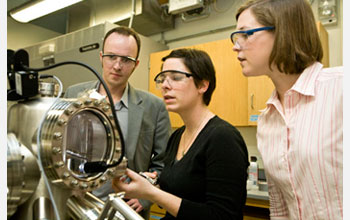 | Tufts University assistant professor Charles Sykes and two graduate students, Erin Iski and April Jewell, use a scanning tunneling microscope (STM) in their lab at Tufts University. Credit: Joanie Tobin/Tufts University Photography |