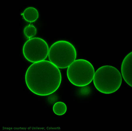 | Agar microgels coated with a bi-layer of chitosan and fluorescein labelled alginate imaged by confocal microscopy |