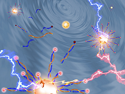 | In this illustration by Yi Zhang, quantum dots are depicted as gold spheres that attract DNA strands linked to cancer risks. When the quantum dots are exposed to certain types of light, they transfer the energy to fluorescent molecules, shown as pink globes, that emit a glow. This enables researchers to detect and count the DNA strands linked to cancer. |